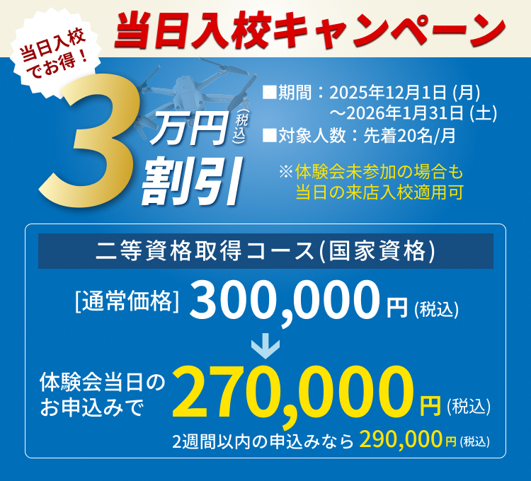 300,000円講習日数 3日~5日 飛行時間10時間以上こんな方にオススメです。